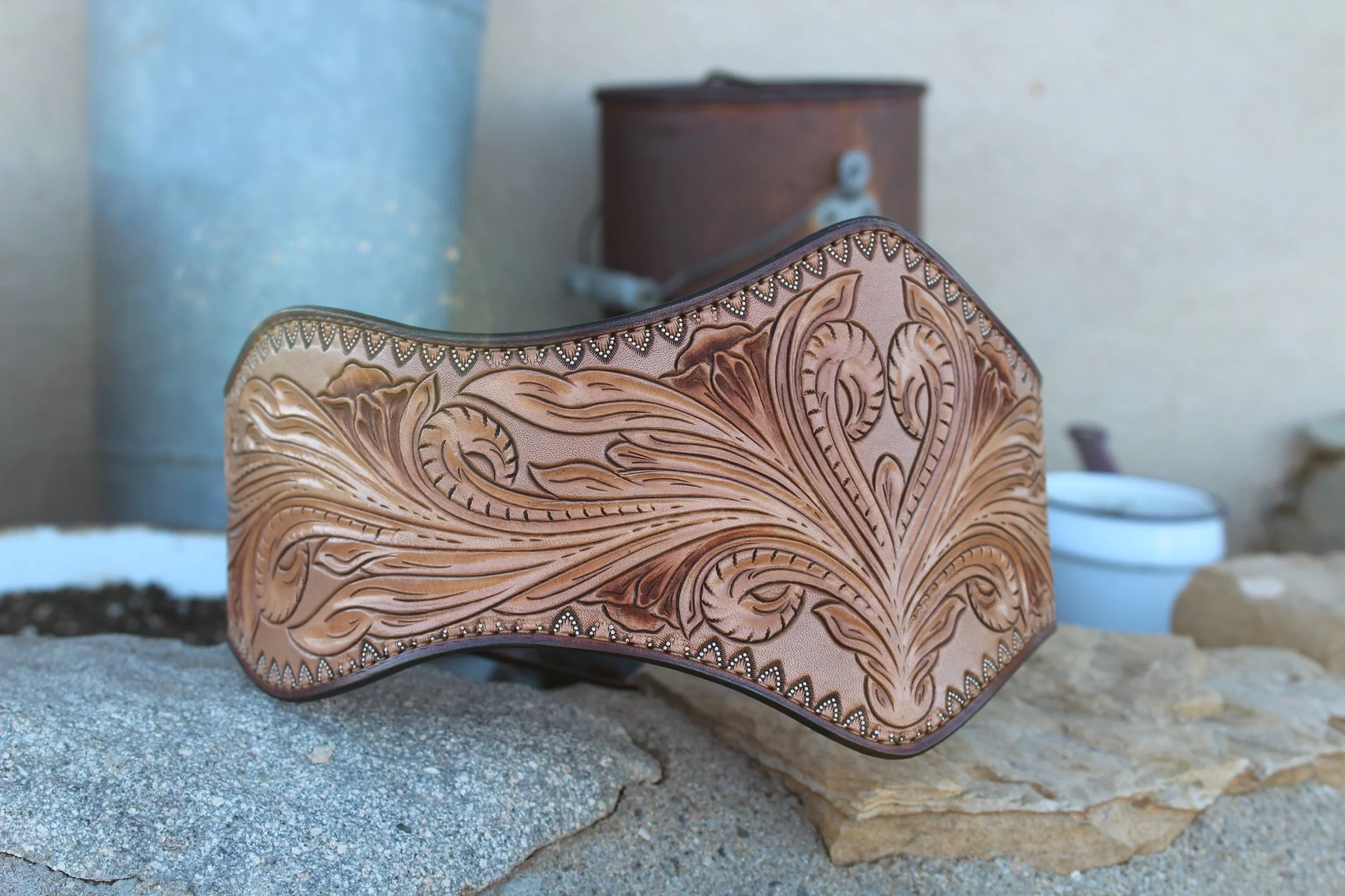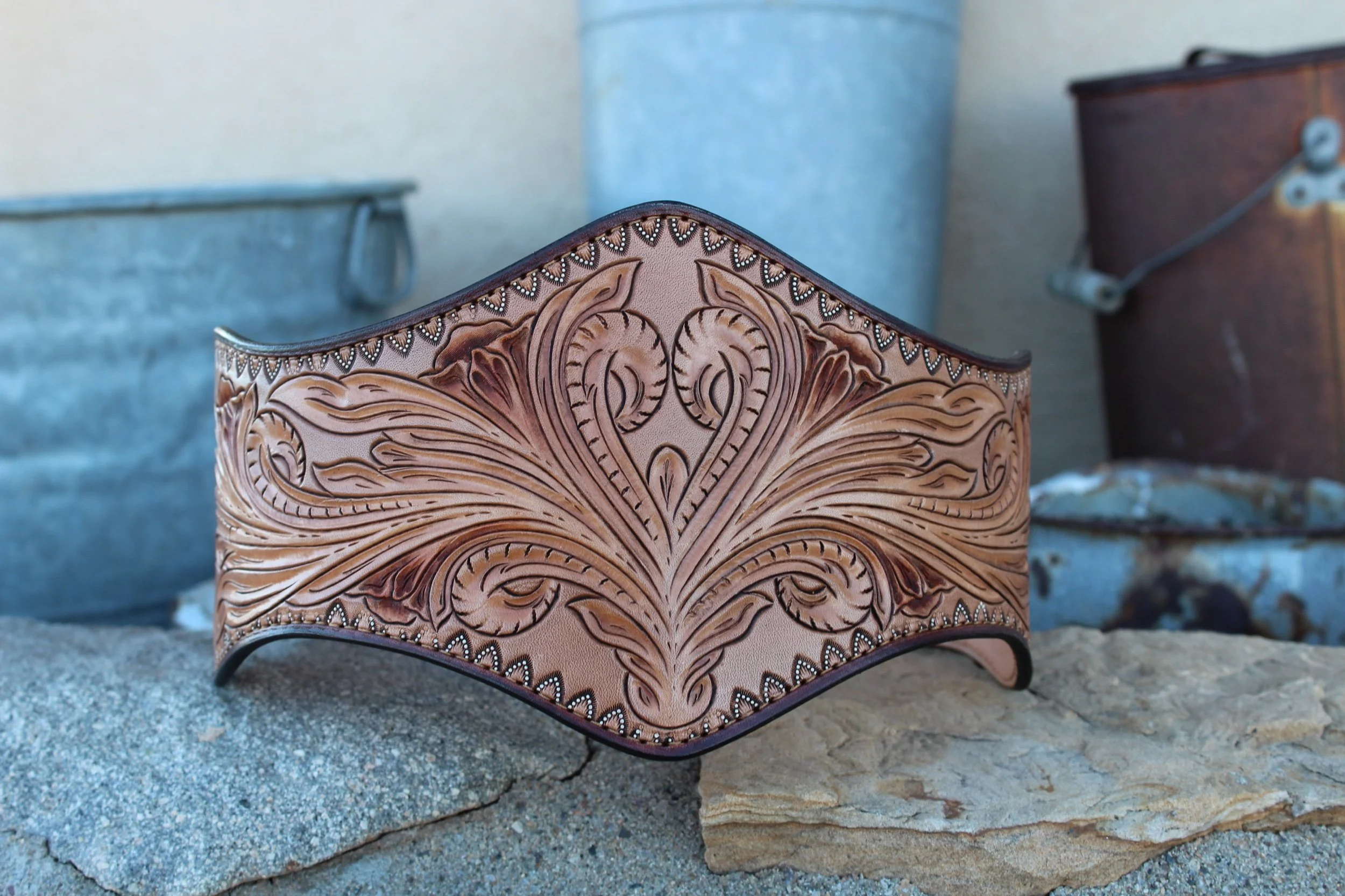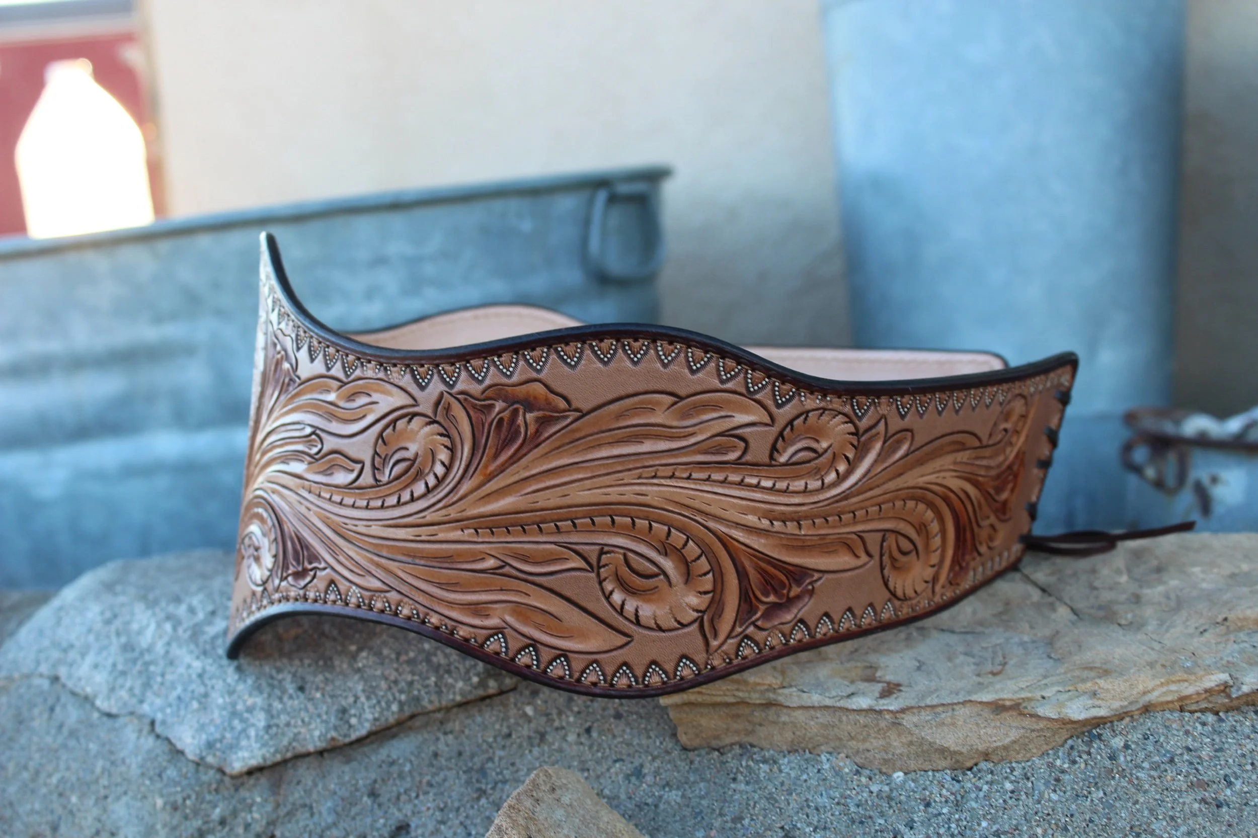 Belt measures 30 inches from end to end & is 5.5 inches tall at its highest point. This belt has a corset style closure.